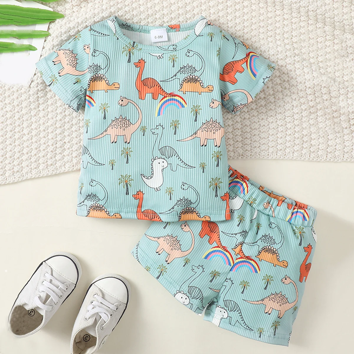2pcs Baby Boys Cute Dinosaur And Tiger Graphic Print T-shirt & Shorts Set Clothes
