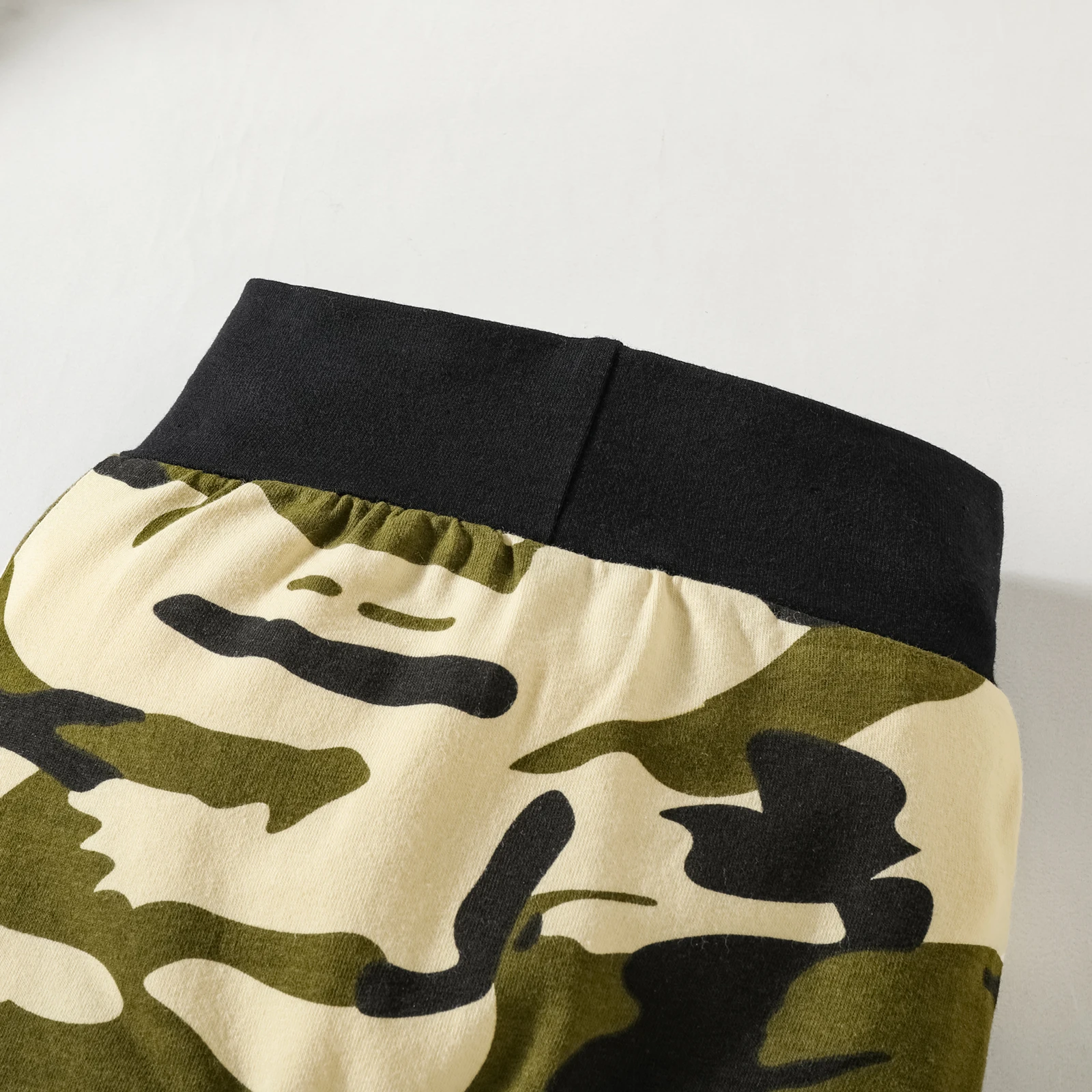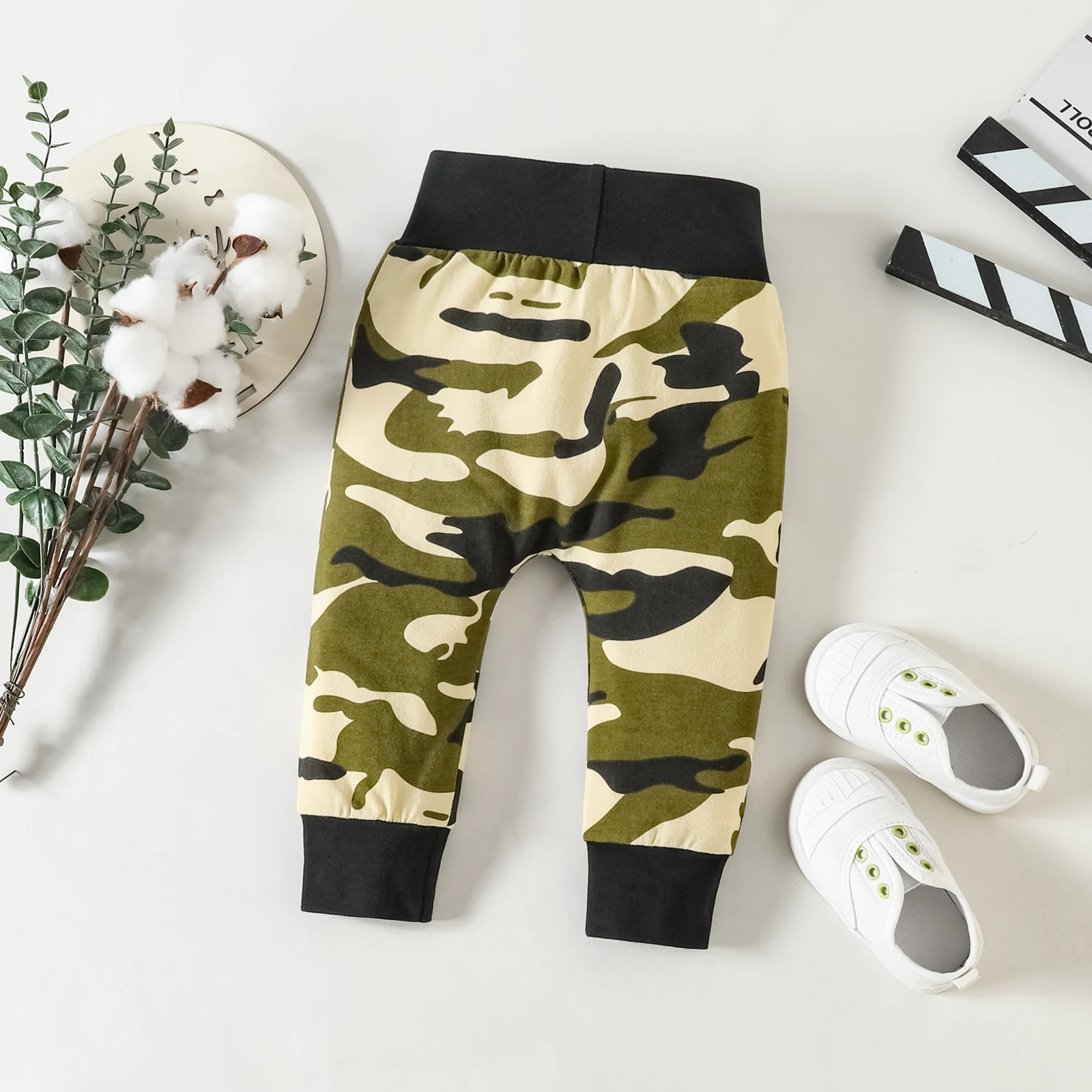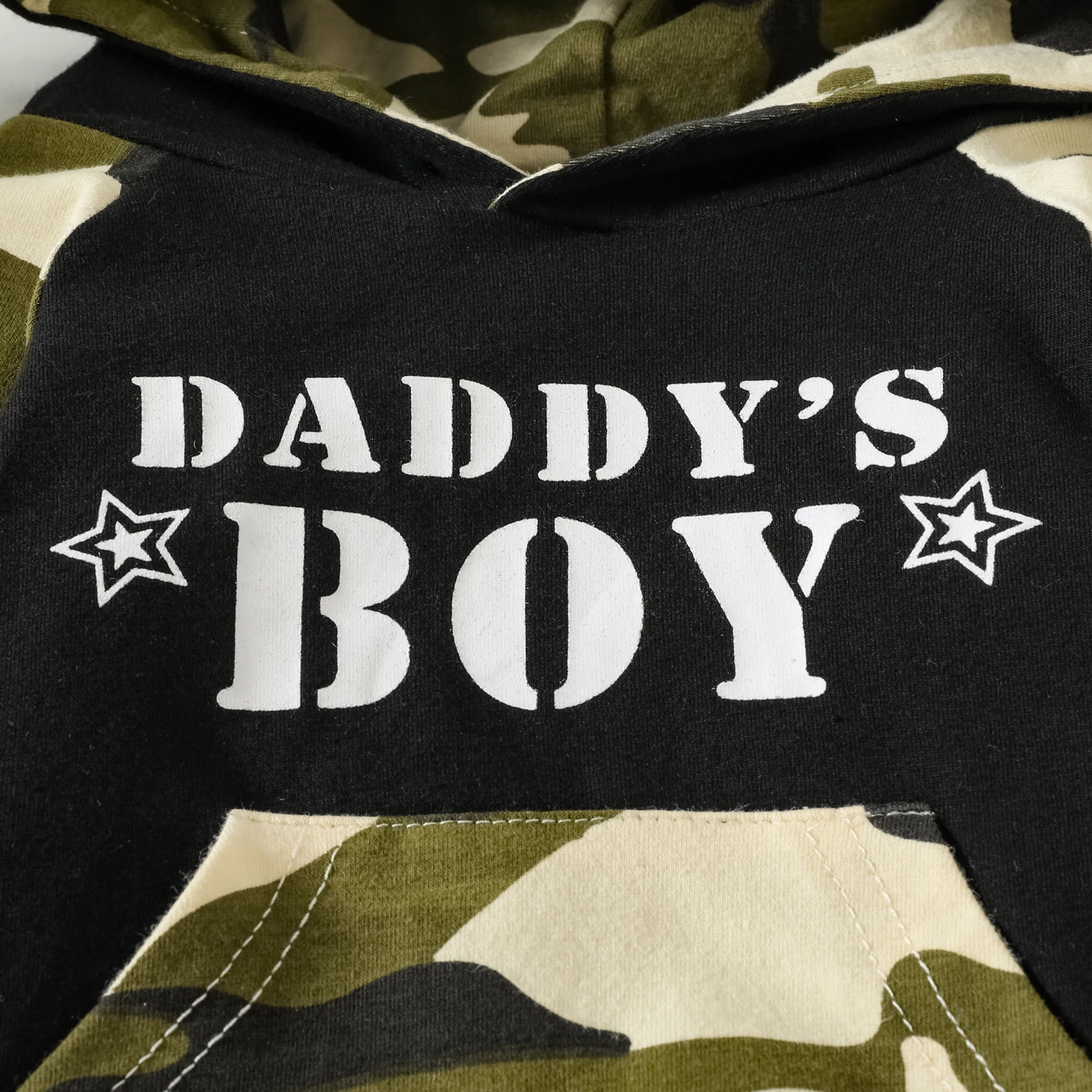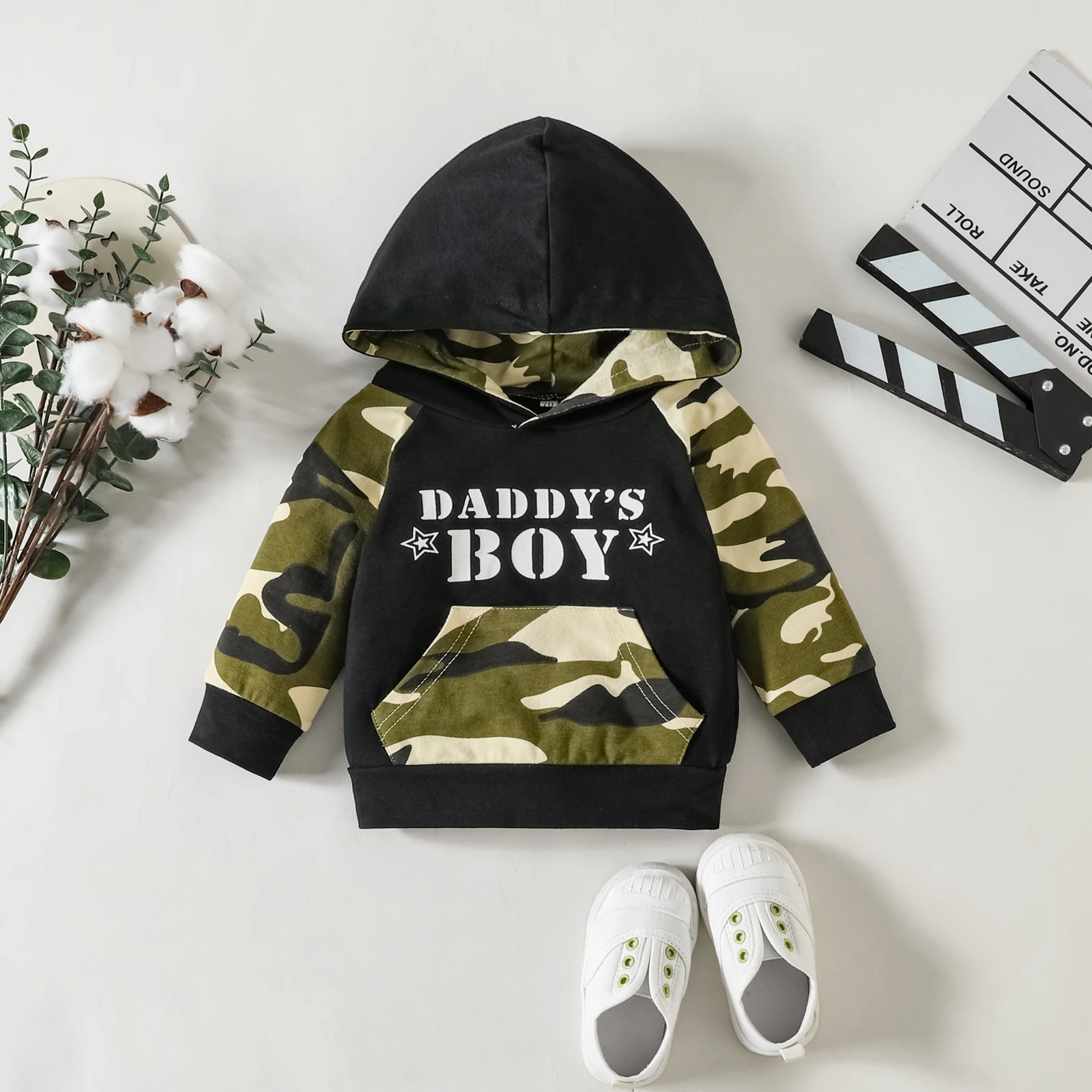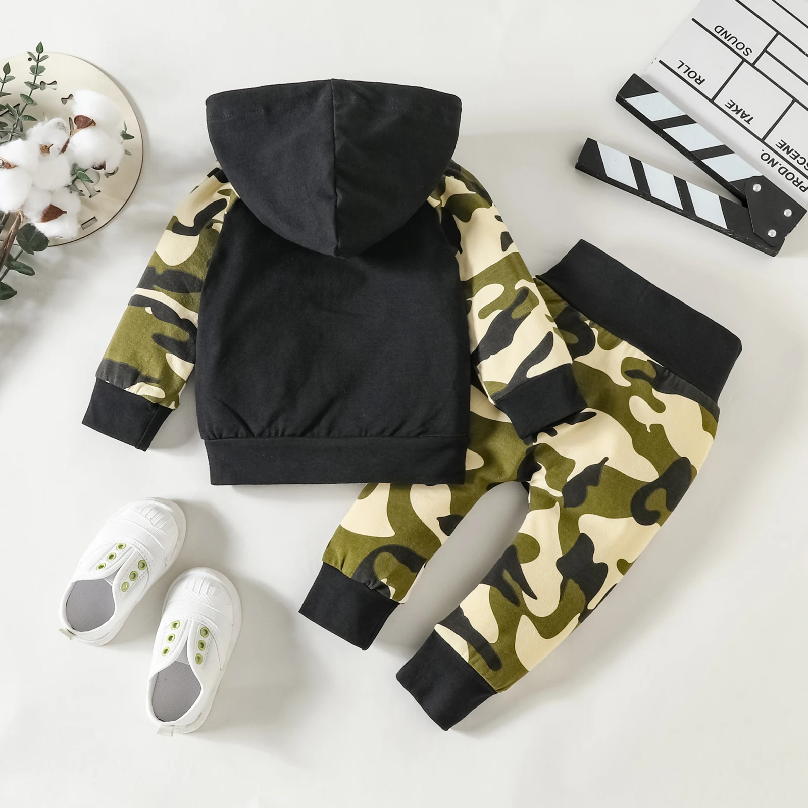 Baby Boys New Army Green Camouflage Letter Print Hooded Long Sleeve Top+Trousers Two-piece Set