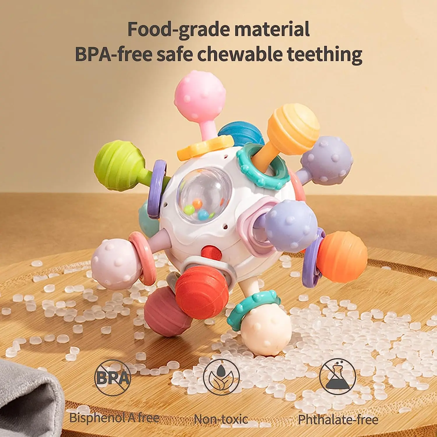 【Color Perception & Audiovisual Development】12 kinds of brightly colored balls, multi-sensory grip rattle and teether encourage grasping and reaching, with a rattle ring that slides back and forth to produce a soft rattling sound.