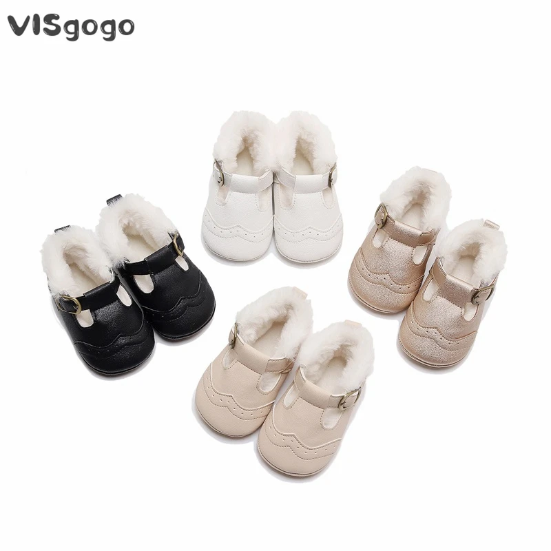 VISgogo Baby Girl Princess Dress Shoes Winter Warm Mary Jane Flats Non-Slip Fleece Crib Shoes